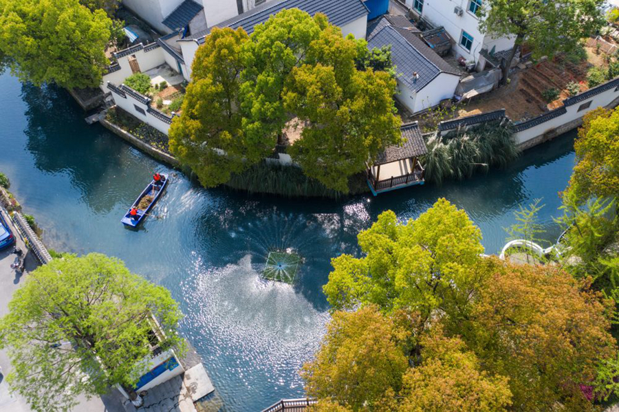 浙江省長興縣龍山街道渚山村,保潔人員進行日常河道護理巡查(2020年4月9日攝,無人機照片)。新華社記者 徐昱 攝