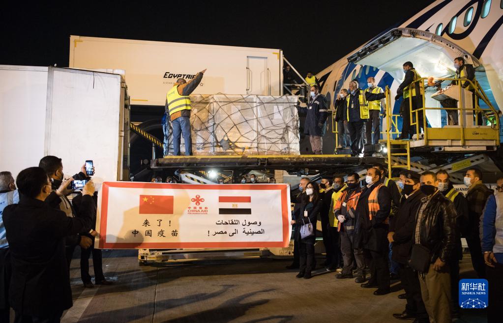 2月23日,在埃及開羅國際機場,工作人員運輸疫苗。中國援助埃及的首批新冠疫苗當(dāng)日凌晨運抵開羅,援助阿盟秘書處的新冠疫苗也同機抵達。新華社記者 鄔惠我 攝