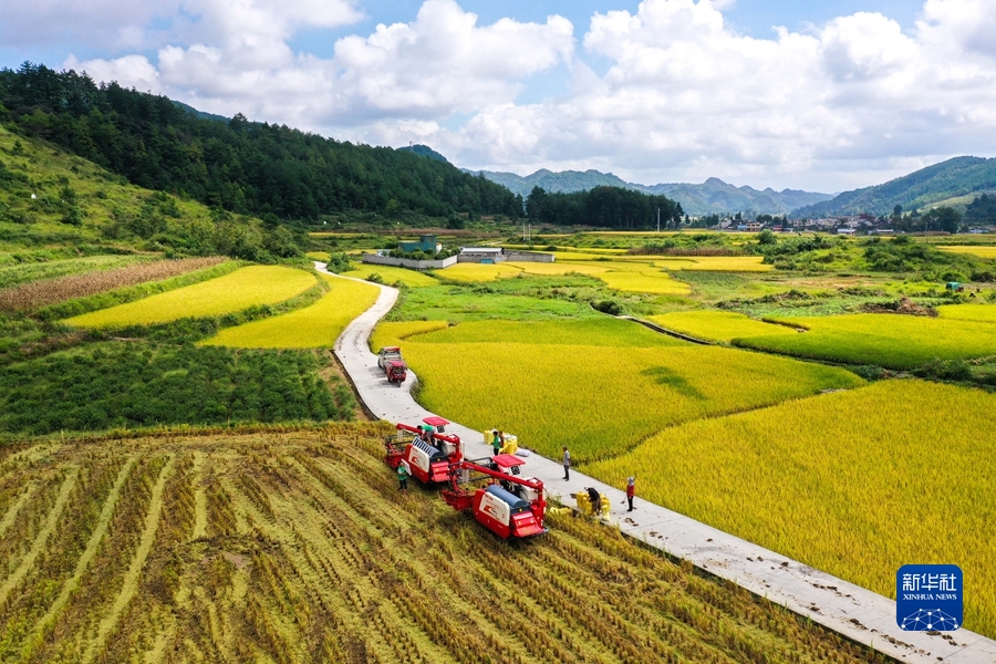 2021年9月15日,貴州省龍里縣灣灘河鎮(zhèn)羊場社區(qū)的農(nóng)民在搶收稻谷(無人機照片)。 新華社記者 楊文斌 攝