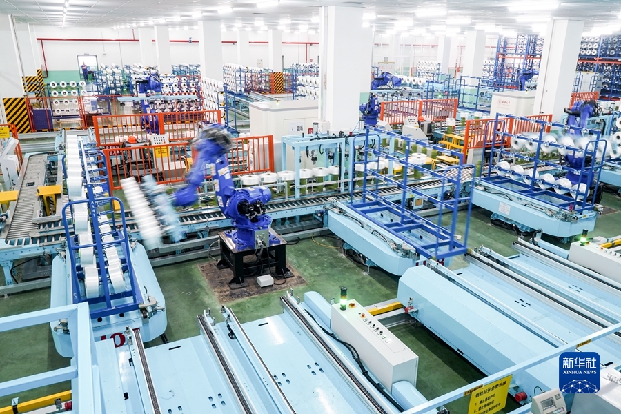 2021年5月14日,在位于江蘇省蘇州市吳江區(qū)盛澤鎮(zhèn)的一家智能車間,機器人在車間內(nèi)自動作業(yè)。新華社記者 李博 攝