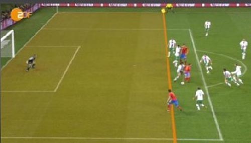 首先質(zhì)疑比利亞進(jìn)球越位的是德國電視二臺。ZDF在回放中給出了明確的鏡頭。ZDF對這個進(jìn)球逐幀慢放,結(jié)果顯示在哈維將球敲向比利亞的一瞬間,比利亞已經(jīng)領(lǐng)先對方最后一名后衛(wèi)半個身位。最終給出了比利亞越位的結(jié)論。此外,哈維之前回接伊涅斯塔的傳球時也有越位嫌疑。