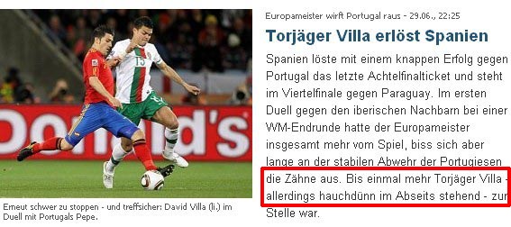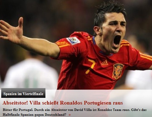 《體育圖片》的標(biāo)題最為醒目:《越位進(jìn)球!比利亞將羅納爾多的葡萄牙踢出局》。文章稱,比利亞在第63分鐘打入了自己世界杯的第四個進(jìn)球,然而這個進(jìn)球卻應(yīng)該是個越位球。隨后在引用比利亞的采訪時這樣描述:比利亞在談到自己的越位進(jìn)球時稱“我并沒看清,重要的我是破門了”。