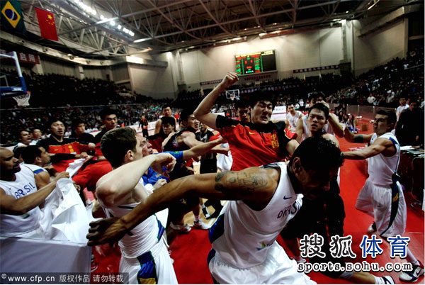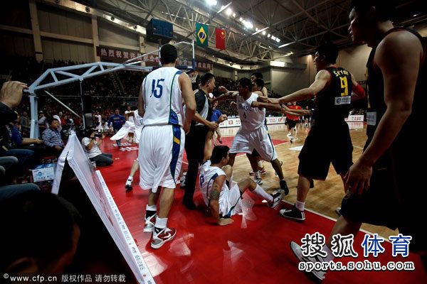 在比賽短暫的暫停之后,場上比賽繼續(xù)進(jìn)行,在巴西隊(duì)完成一次自己進(jìn)攻,中國隊(duì)進(jìn)入進(jìn)攻階段后,中國隊(duì)再次被對手犯規(guī)倒地,這下子場上一下子亂了。中國隊(duì)隊(duì)員和巴西隊(duì)隊(duì)員開始發(fā)生肢體沖突,雙發(fā)替補(bǔ)也沖上場去,開始肉搏。