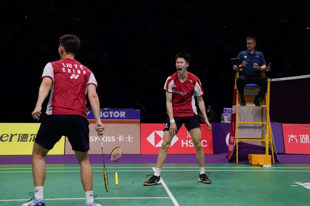 5月20日,中國隊組合劉雨辰/歐烜屹(右)賽后慶祝。新華社記者 李博 攝