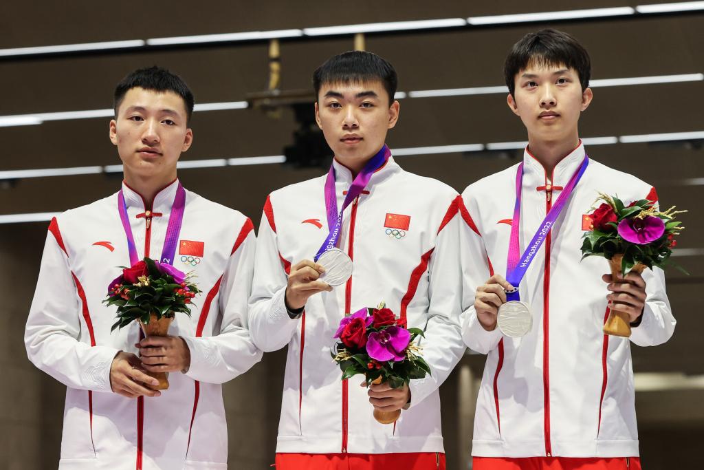 9月29日,中國隊選手田珈銘(左)、于浩(中)、杜林澍在頒獎儀式上。新華社記者 單宇琦 攝