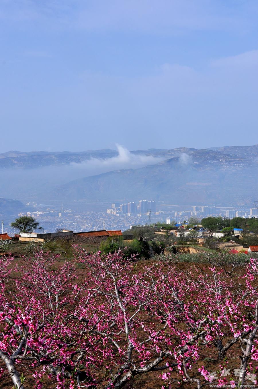 (秦安縣城及被稱(chēng)為“中國(guó)美麗田園”的“秦安何灣桃花景觀(guān)”上空,云霧繚繞,云蒸霞蔚,整個(gè)景區(qū),如夢(mèng)如幻,恍如仙境。) |