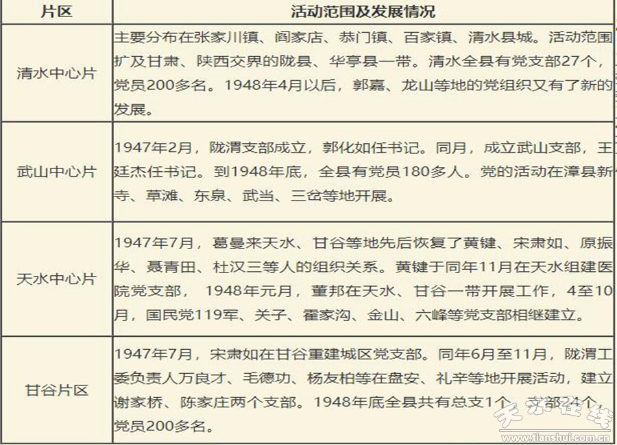 天水中心片1947年7月,葛曼來(lái)天水、甘谷等地先后恢復(fù)了黃鍵、宋肅如、原振華、聶青田、杜漢三等人的組織關(guān)系。黃鍵于同年11月在天水組建醫(yī)院黨支部, 1948年元月,董邦在天水、甘谷一帶開(kāi)展工作,4至10月,國(guó)民黨119軍、關(guān)子、霍家溝、金山、六峰等黨支部相繼建立。