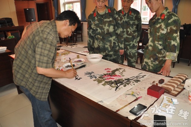 此次活動(dòng)邀請了天水市文化館館長李靖,以及劉琳花、陳鋒、尹文東、楊陽、南恒、閆小鵬等知名書畫家共同參加創(chuàng)作。老師們現(xiàn)場揮毫潑墨,用一幅幅蒼勁有力的繪畫、書法作品,讓官兵們深刻感受到了中華民族傳統(tǒng)文化的博大精深和精神韻律。書畫作品清新自然、氣韻貫通,表達(dá)了對官兵的深情厚意和美好祝福,深受戰(zhàn)士們的歡迎和喜愛。一副副佳作集中展示了藝術(shù)家高超的藝術(shù)水平,讓戰(zhàn)士們受到了一次難得的傳統(tǒng)文化教育,現(xiàn)場流連駐足拍手稱絕,不但提升了自身書畫品味和文化追求,也讓戰(zhàn)士們在勞碌緊張的執(zhí)勤工作中放松了心情,愉悅了身心,充分體會(huì)著“快樂工作、幸福生活”的真正內(nèi)涵。