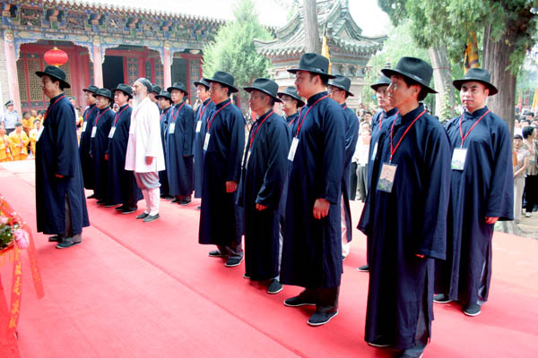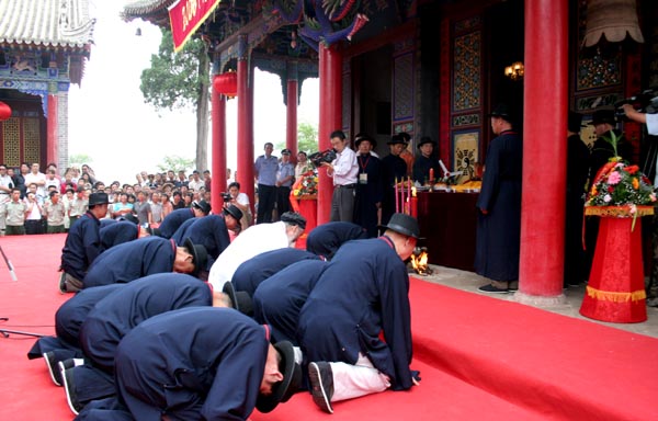 在祭祀大典上,按照傳統(tǒng)禮儀進(jìn)行的民間祭祀活動持續(xù)1個多小時,來自民間的各種文體娛樂活動助興上演,把卦臺山的民間祭祀活動推向高潮。