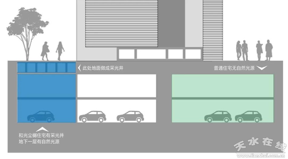 地面設計多個陽光天井,通過建筑自身引入自然光線,解決地下車庫采光問題,降低潮濕率,保持地下室四季通風、清爽干凈,仿生人工照明系統(tǒng),指引路線,歸家出行,皆能享受更舒適的體驗。