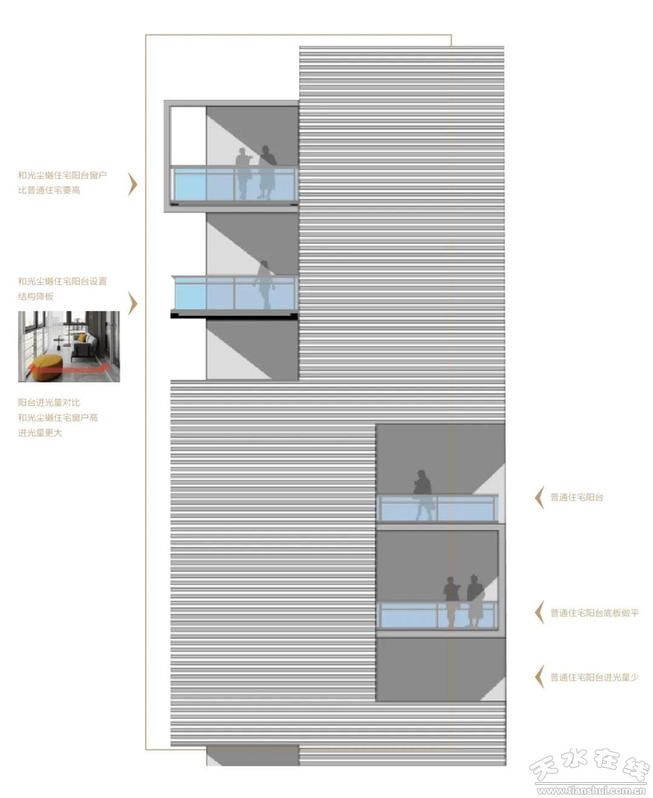 保利·和光塵樾將陽臺底板下沉11CM,把窗戶抬高10CM,增加住宅采光面,相較于普通住宅,我們把更多的光線充分引入室內,讓清風抵達的時候少了建筑的阻擋。