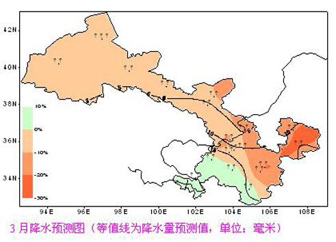 甘肅省氣象臺預(yù)測,2008年3月甘肅省降水,與歷年同期相比,甘南、隴南南部略偏多,省內(nèi)其余地方偏少1~2成。3月全省平均氣溫正常略偏高。
