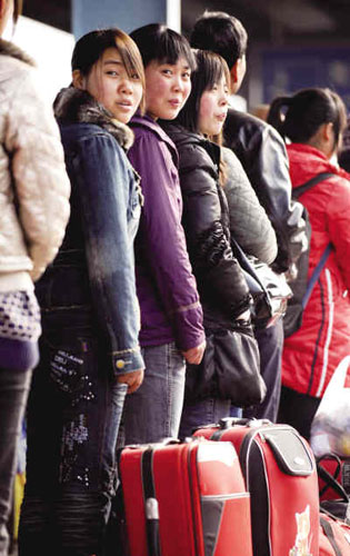 (作為全國勞務輸出大省,甘肅省將培育勞務品牌作為農(nóng)民工穩(wěn)定就業(yè)和增加收入的重要措施。圖為春節(jié)后,去北京從事家政服務的甘肅天水“白娃娃家政服務員”在火車站候車。(新華社記者 張錳 攝))