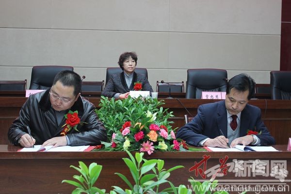 。ǹh委副書記、縣長(zhǎng)申君明與甘肅鴻瑞實(shí)業(yè)有限公司總經(jīng)理彭俊文先生簽訂投資協(xié)議)