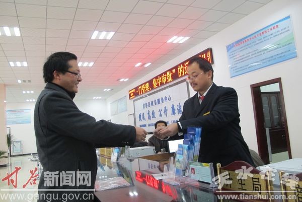 “請問您需要什么幫助?;請到第三個窗口辦理審核后馬上為您辦理;手續(xù)全部辦好了,請拿好自己的資料和證件!……”這是12月20日記者在新投入運行的甘谷縣政務(wù)服務(wù)中心大廳聽到的話語。