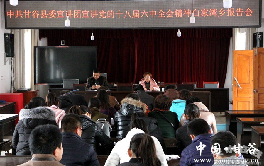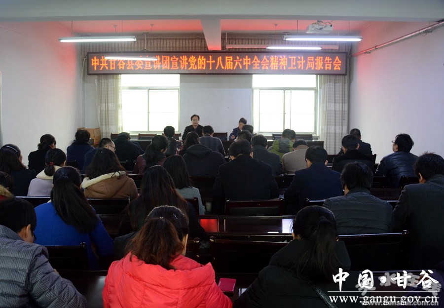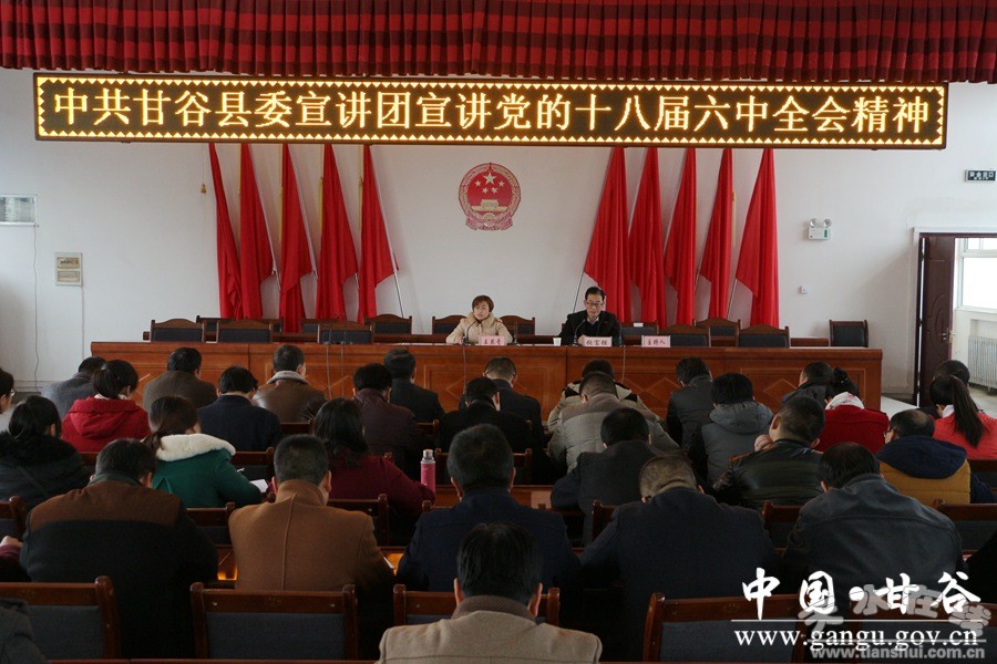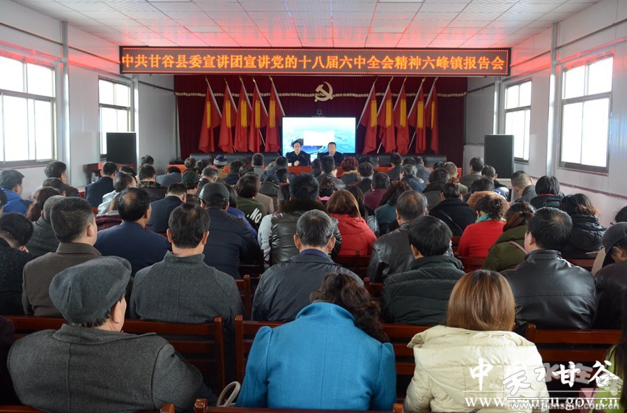 為深入學(xué)習(xí)宣傳貫徹黨的十八屆六中全會(huì)精神,按照中央和省市縣委總體部署要求,11月22日,甘谷縣委宣講團(tuán)深入六峰鎮(zhèn)宣講黨的十八屆六中全會(huì)精神,鎮(zhèn)村兩級(jí)干部共計(jì)100多人聆聽(tīng)報(bào)告。