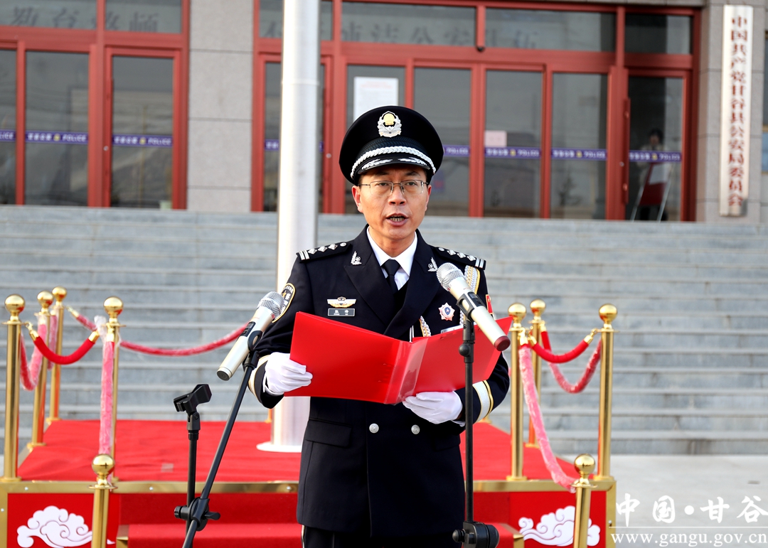 “我宣誓:堅(jiān)決擁護(hù)中國共產(chǎn)黨的絕對(duì)領(lǐng)導(dǎo),矢志獻(xiàn)身崇高的人民公安事業(yè),對(duì)黨忠誠、服務(wù)人民、執(zhí)法公正、紀(jì)律嚴(yán)明……”1月10日,甘谷縣公安局隆重舉行升警旗暨警禮服列裝儀式慶祝中國人民警察節(jié)。副縣長、縣公安局黨委書記、局長張濤出席儀式并致辭,在家局領(lǐng)導(dǎo)、各所隊(duì)室全體民警共計(jì)260余人參加儀式。