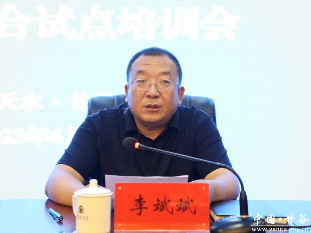 李斌斌代表甘谷縣委、縣政府,對參加本次培訓會議的各位領導和其他兄弟縣區(qū)的同志們表示熱烈的歡迎。他說,甘谷縣將以此次試點為契機,以飽滿的工作熱情和嚴謹?shù)墓ぷ髯黠L,積極探索、勇于創(chuàng)新、大膽實踐,嚴格按照試點方案要求,有計劃有步驟地推進試點工作。通過試點發(fā)現(xiàn)問題、研究問題,對試點各個環(huán)節(jié)及試點結(jié)果進行全面總結(jié)分析,努力形成一批可借鑒、可推廣的經(jīng)驗做法,確保高質(zhì)量圓滿完成綜合試點任務。