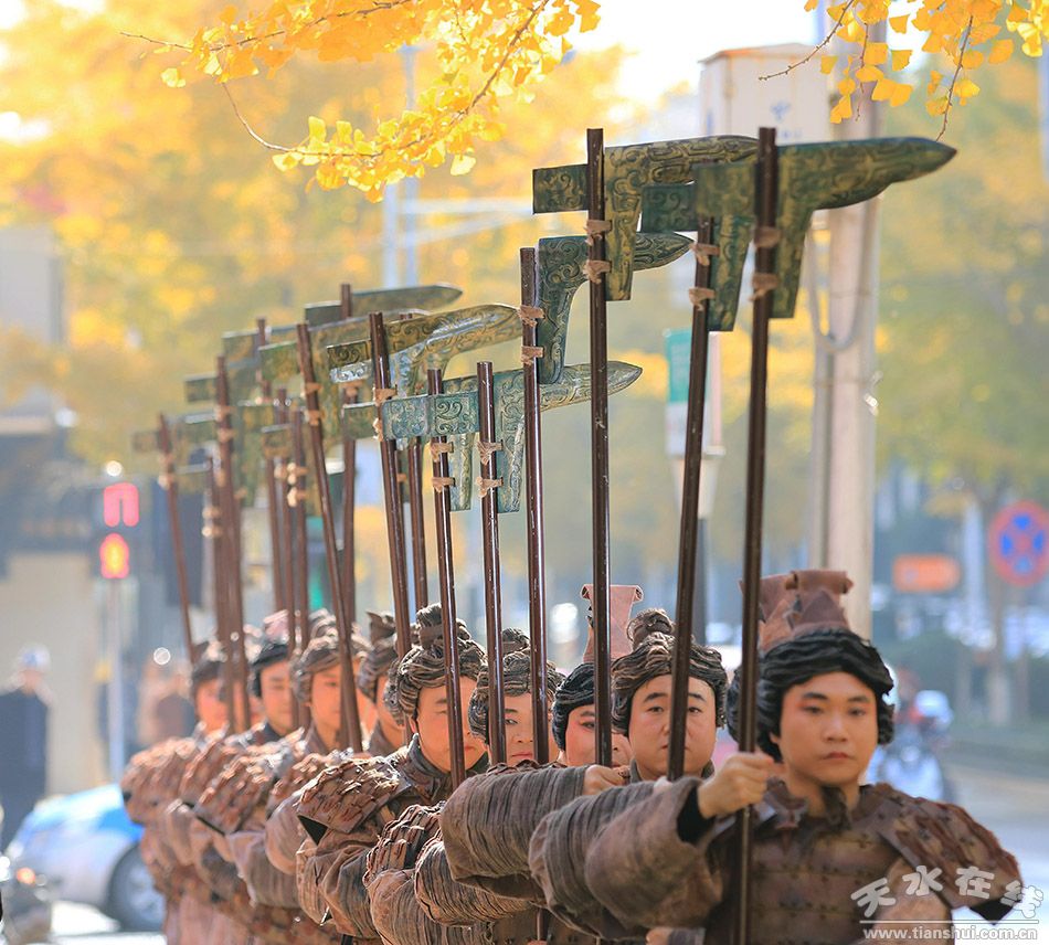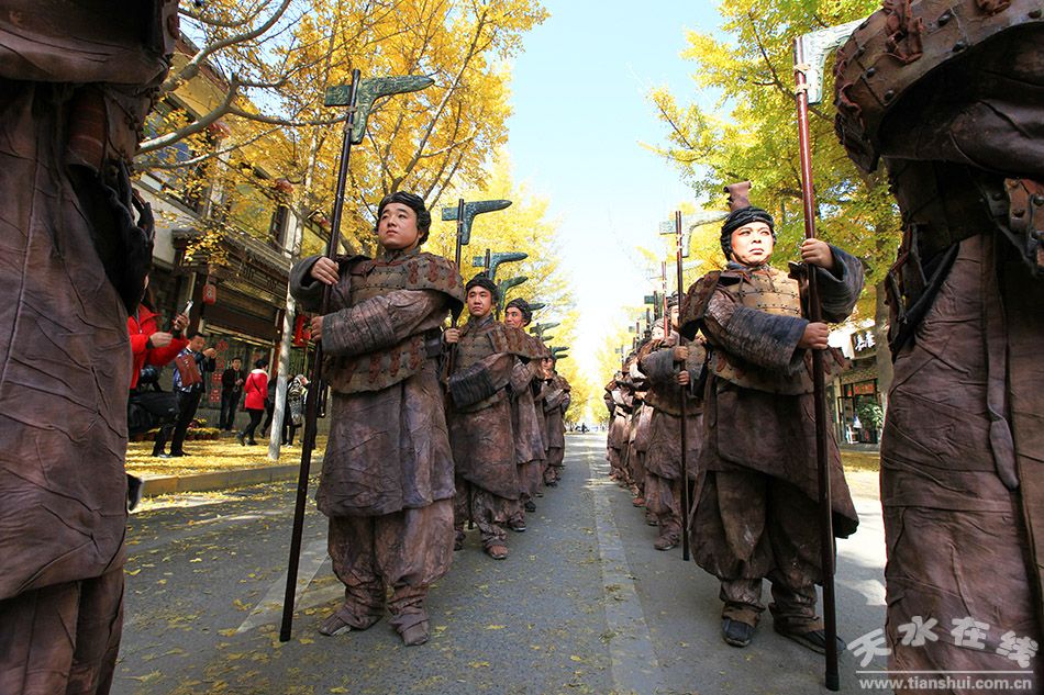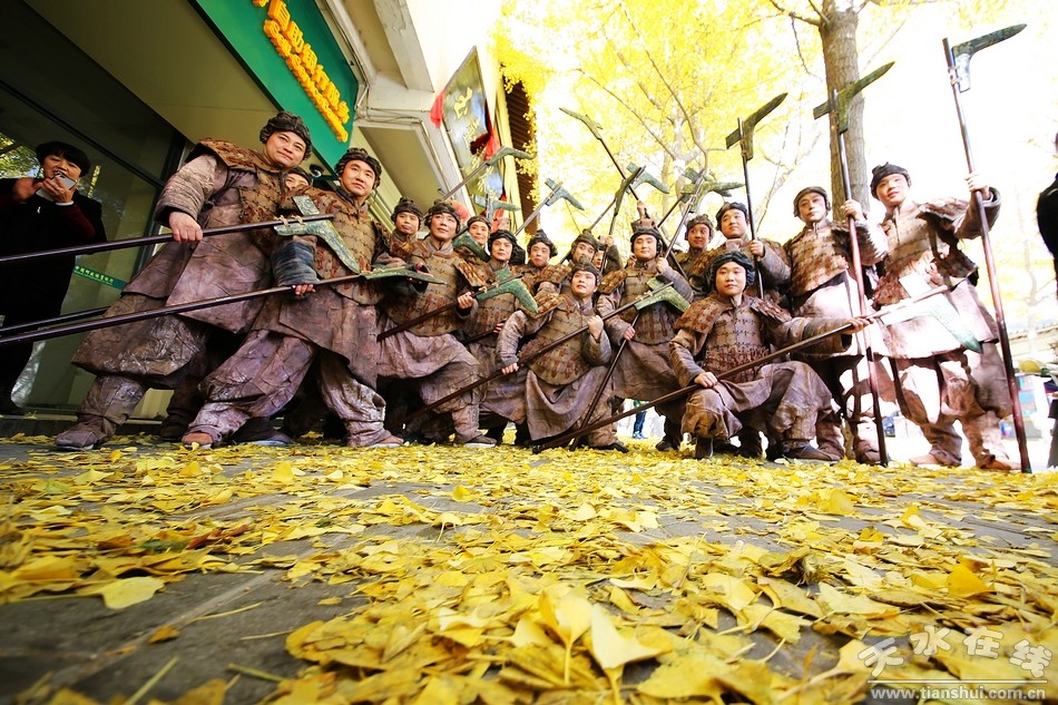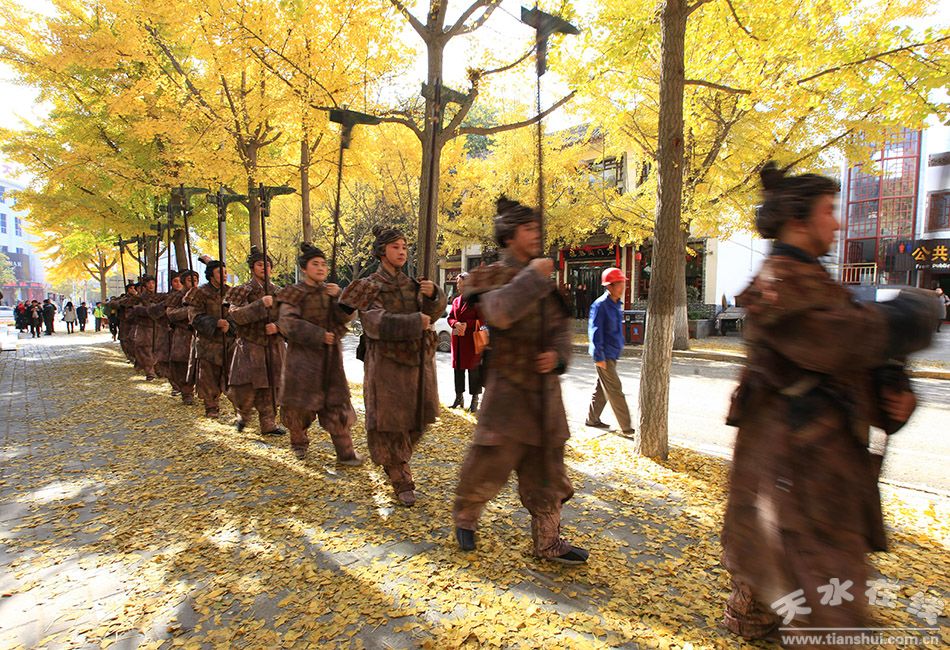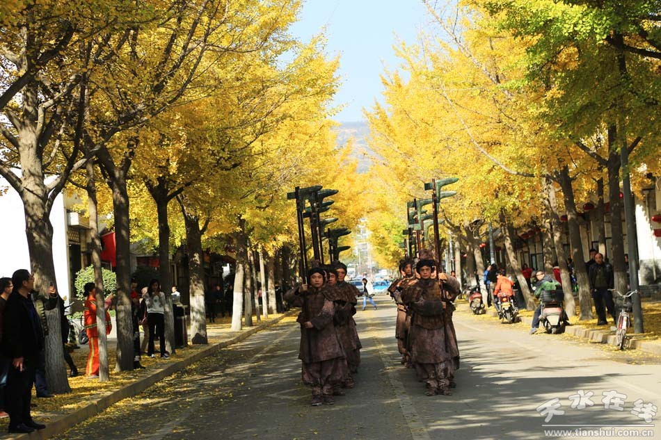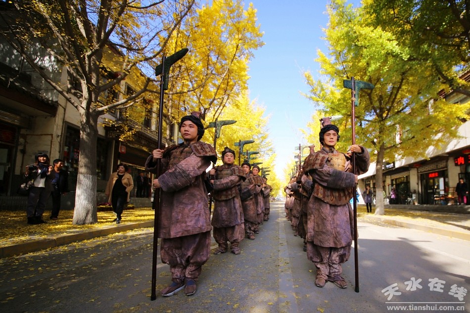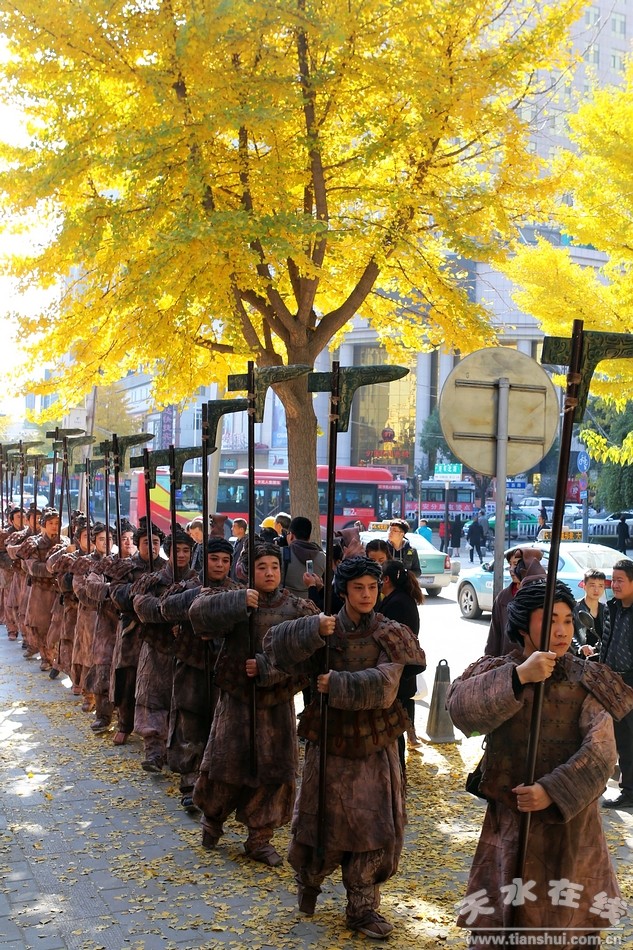 很多人都說“因為一個人,思念一座城”。其實,位于市中心的青年南北路之于天水,卻是因為一條街,火了一座城。初冬時分,寒意漸生。但是,天水的青年南北路,確因為金黃色的葉子給予了行人無限的溫暖。更有那從天水市秦劇團原創(chuàng)歷史秦腔劇《大秦文公》中走出來的20名“大秦勇士”披甲執(zhí)戈,“出征”青年北路,踏上“黃金大道”,實景演繹“滿城盡帶黃金甲”的美景,更是讓行人和游客驚喜連連,并通過微信朋友圈分享美景圖片和視頻,引發(fā)朋友圈瘋狂刷屏,讓天水城美美又火了一把。