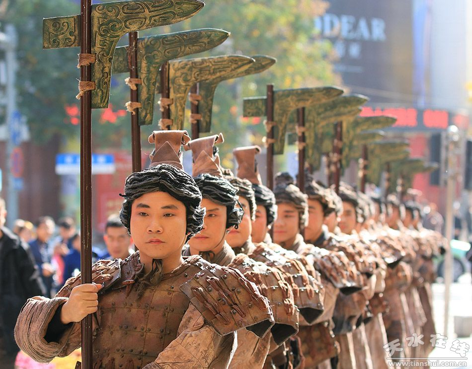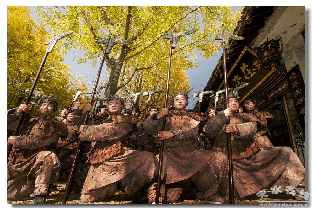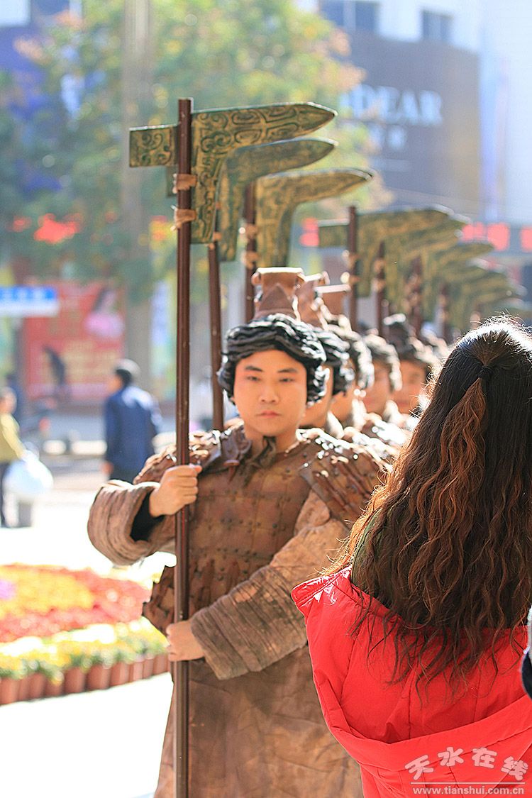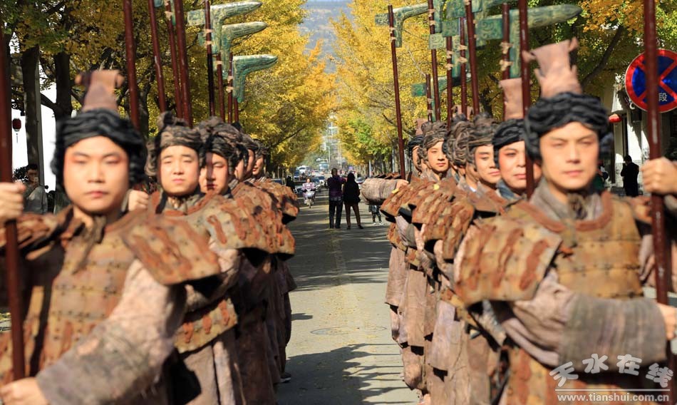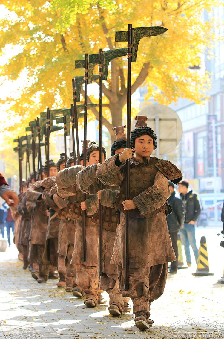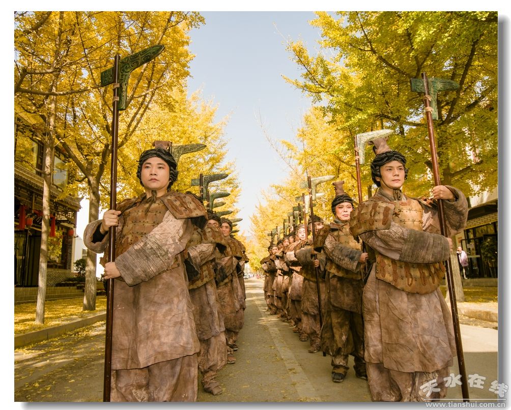 很多人都說“因為一個人,思念一座城”。其實,位于市中心的青年南北路之于天水,卻是因為一條街,火了一座城。初冬時分,寒意漸生。但是,天水的青年南北路,確因為金黃色的葉子給予了行人無限的溫暖。更有那從天水市秦劇團原創(chuàng)歷史秦腔劇《大秦文公》中走出來的20名“大秦勇士”披甲執(zhí)戈,“出征”青年北路,踏上“黃金大道”,實景演繹“滿城盡帶黃金甲”的美景,更是讓行人和游客驚喜連連,并通過微信朋友圈分享美景圖片和視頻,引發(fā)朋友圈瘋狂刷屏,讓天水城美美又火了一把。