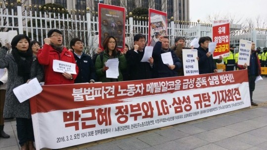 | (韓民間團(tuán)體抗議三星代工廠非法外派員工 圖片來源:韓國(guó)《mediatoday》) |