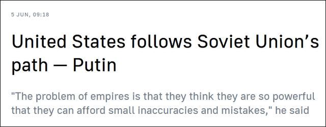 “美國正以自信且堅定的步伐,走在蘇聯(lián)的老路上”。當(dāng)?shù)貢r間6月4日,俄羅斯總統(tǒng)普京在參加年度經(jīng)濟論壇——圣彼得堡國際經(jīng)濟論壇期間,對媒體直言不諱地指出,美國正犯下一個典型的問題:對自己無限實力充滿信心,給自己制造無法應(yīng)對的問題,就像曾經(jīng)的蘇聯(lián)那樣。
