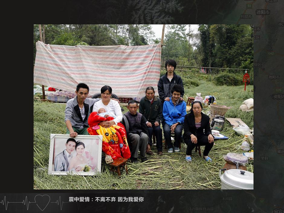 2013年4月21日,蘆山縣龍門(mén)鄉(xiāng)紅星村高家壩組,高進(jìn)強(qiáng)(左一),他是父親,震中拼盡全力撐起空隙,只為讓妻女逃生。他們已經(jīng)在家附近搭建了臨時(shí)家園。