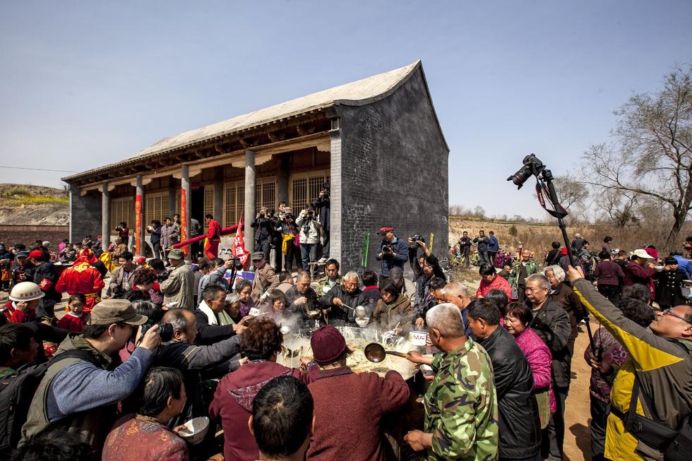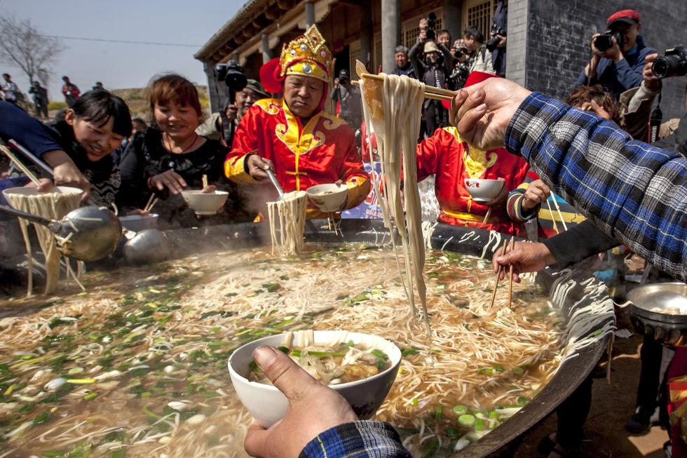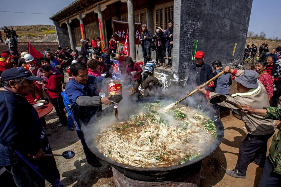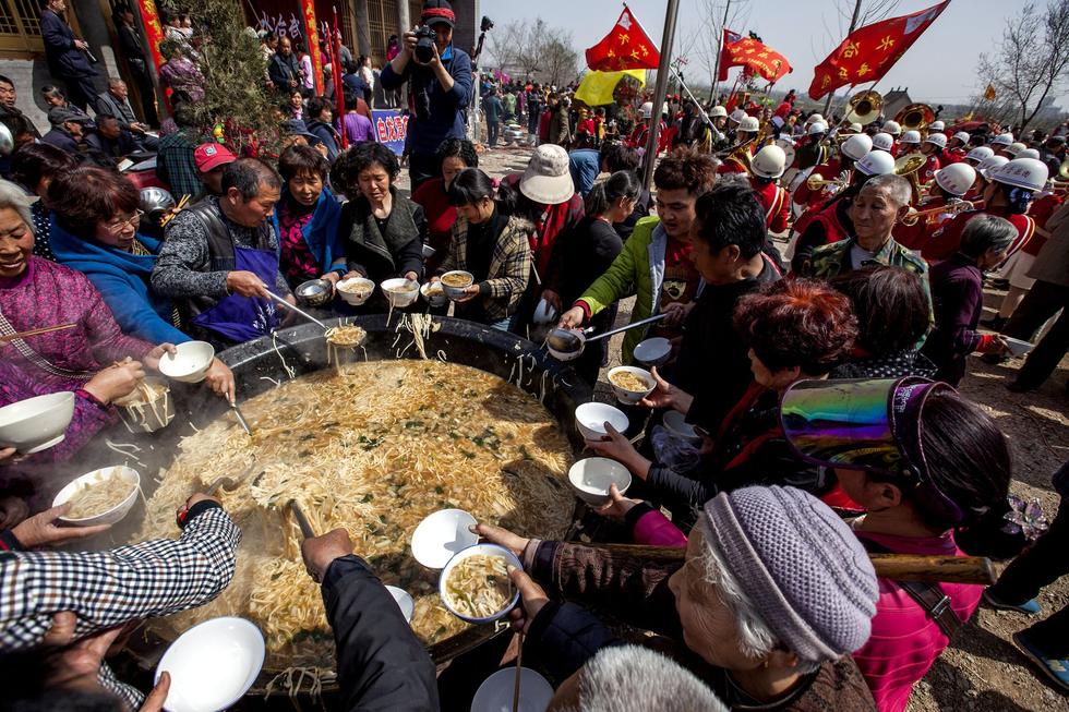 2015年3月21日,河南省安陽市,安陽縣水冶鎮(zhèn)阜城附近的白龍?zhí)稄R會上,2000人同吃“大鍋飯”(湯面條),場面宏大,讓人嘆為觀止。
