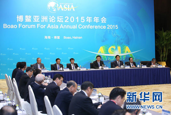 3月29日,國家主席習近平在海南省博鰲國賓館同出席博鰲亞洲論壇2015年年會的中外企業(yè)家代表座談。 新華社記者 龐興雷 攝