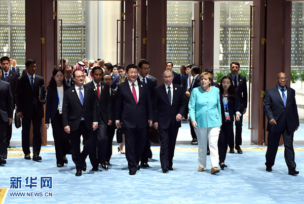 9月4日,二十國(guó)集團(tuán)領(lǐng)導(dǎo)人第十一次峰會(huì)在杭州國(guó)際博覽中心舉行。國(guó)家主席習(xí)近平主持會(huì)議并致開(kāi)幕辭。這是二十國(guó)集團(tuán)成員和嘉賓國(guó)領(lǐng)導(dǎo)人、有關(guān)國(guó)際組織負(fù)責(zé)人步入會(huì)場(chǎng)。新華社記者李濤攝
