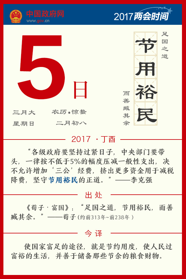 3月5日,李克強(qiáng)總理在作《政府工作報(bào)告》時(shí)指出,各級(jí)政府要堅(jiān)持過緊日子,中央部門要帶頭,一律按不低于5%的幅度壓減一般性支出,決不允許增加“三公”經(jīng)費(fèi),擠出更多資金用于減稅降費(fèi),堅(jiān)守節(jié)用裕民的正道。