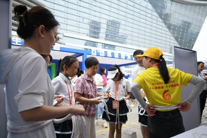 6月16日,在全國“安全宣傳咨詢?nèi)铡敝鲌?chǎng)活動(dòng)上,市民學(xué)習(xí)繩索打結(jié)方法。新華社記者胥冰潔攝