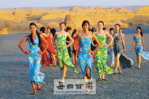 9月3日,第十屆敦煌國(guó)際模特服飾藝術(shù)節(jié)中國(guó)賽區(qū)的模特冠、亞、季軍決賽正在火熱進(jìn)行。從9月2日開(kāi)始,模特們分別在敦煌雅丹國(guó)家地質(zhì)公園和鳴沙山、月牙泉景區(qū)進(jìn)行了自選裝、泳裝、晚裝等集體及個(gè)人形象展示。