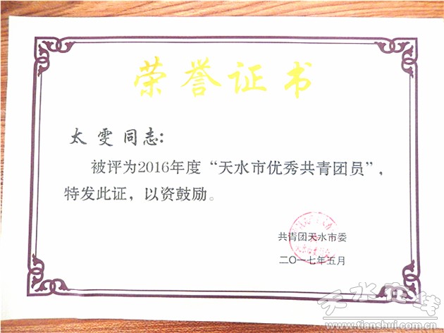 今年“五四”期間,共青團(tuán)天水市委評(píng)選表彰了一批優(yōu)秀支部和個(gè)人。天水一中團(tuán)委,市一中教師黃冬冬和高三級(jí)學(xué)生太雯分別獲得2016年度天水市“五四紅旗團(tuán)委”、“優(yōu)秀團(tuán)干部”、“優(yōu)秀團(tuán)員”榮譽(yù)。