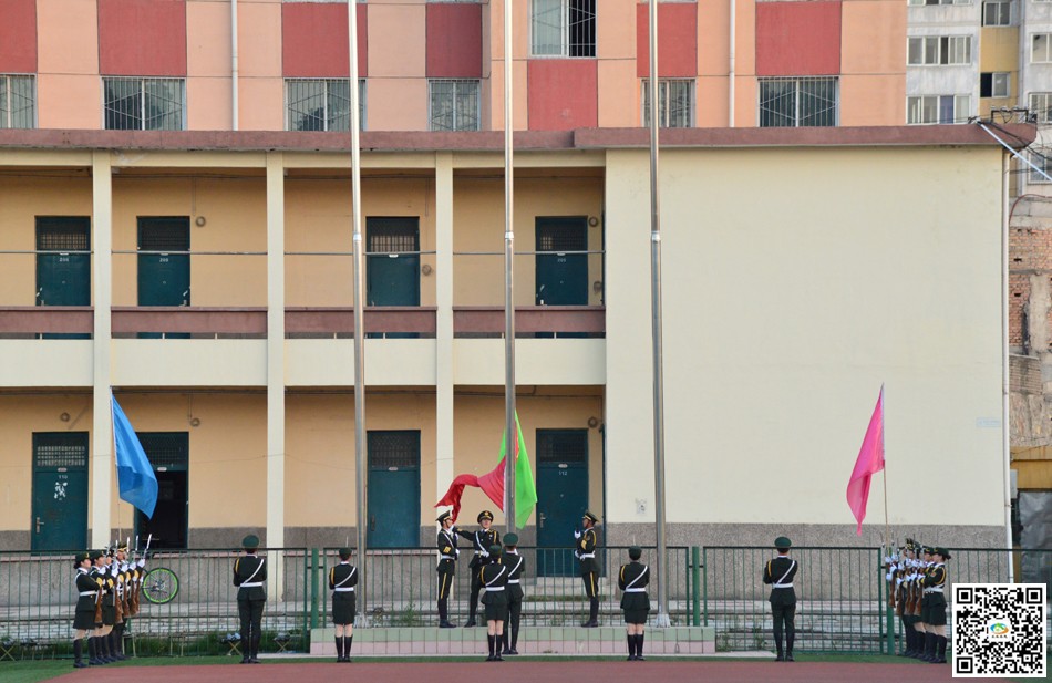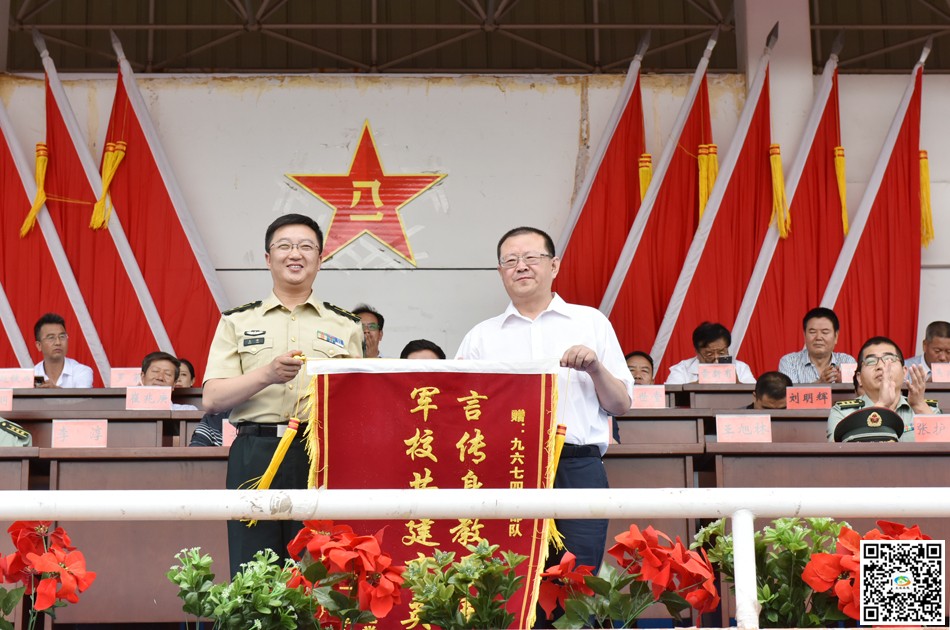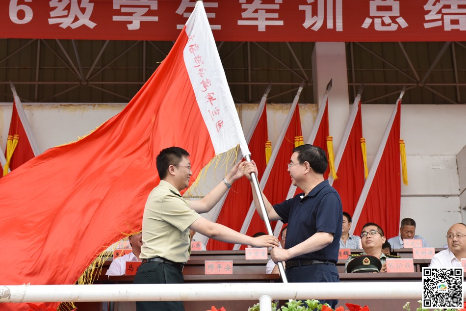 師平安代表學校接收了軍訓團團旗,王旭林代表學校向96743部隊贈送了錦旗,96743部隊政治工作部副主任王峰接旗。