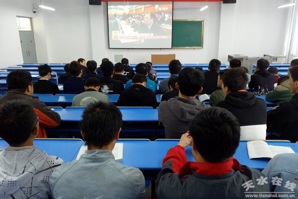 學院在家領導李宗義、趙彥軍、堅葆林、張德龍、毛文輝、霍五堂及廣大師生在五號樓多功能廳認真收聽收看習近平同志代表第十八屆中央委員會向大會作的題為《決勝全面建成小康社會 奪取新時代中國特色社會主義偉大勝利》的報告。學生在校園、教室、宿舍通過廣播、互聯(lián)網等多種方式收聽收看十九大開幕式直播。收聽收看過程中,大家不時在筆記本上認真做記錄。