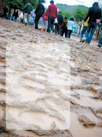 市民在泥濘的道路上艱難前行。本報(bào)記者蔣生連攝