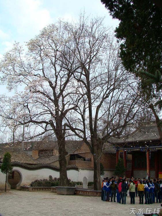 “雙玉蘭堂”內(nèi)幽柏老槐、遮天蔽日,地有清泉甘洌,噴流如練。唐肅宗乾元二年(759年),詩人杜甫流寓秦州,曾游其寺,賦《太平寺泉眼》詩曰:“取供十方僧,香美勝牛乳!逼渲袃煽霉虐,蒼勁挺拔,其中一柏又寄生一棵槐樹,槐樹中又寄生一棵椿樹。邑人前甘肅省長鄧寶珊先生生前曾贊三棵套生樹為:“柏槐孕椿”。(圖/文:李永生 李鳳旗)