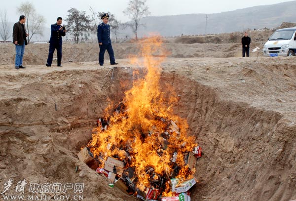 對(duì)2009年查處的假冒偽劣飲料、食品等價(jià)值10多萬(wàn)元商品進(jìn)行集中銷(xiāo)毀。