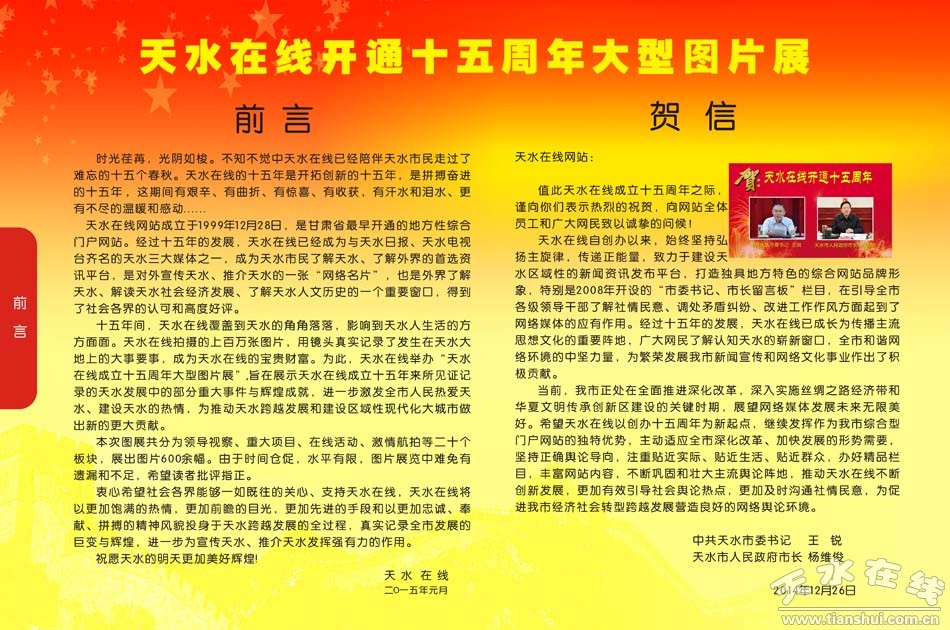 1月20日上午,隨著麥積區(qū)2015年“兩會(huì)”的隆重召開,天水在線成立十五周年大型圖片展也在“兩會(huì)”所在地麥積區(qū)政府大院拉開帷幕。