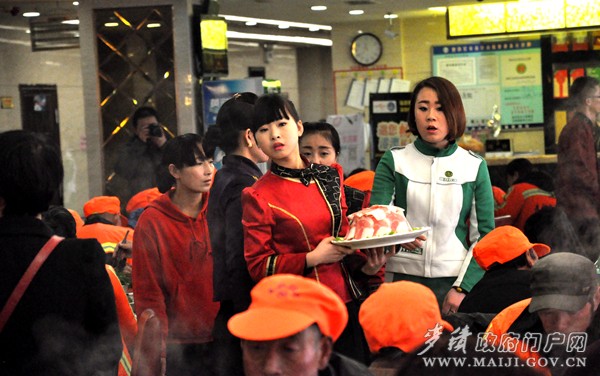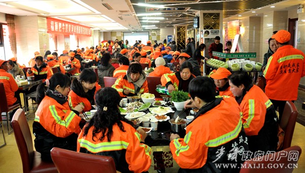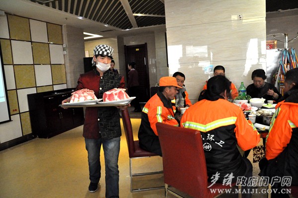 店外寒風(fēng)凜冽,店內(nèi)飄香四溢。2月10日,臨近中午,福順尚品肥;疱伒陜(nèi)顯得人聲鼎沸,歡聲笑語,里面清一色坐滿了環(huán)衛(wèi)工人,這可不是環(huán)衛(wèi)工人在包場聚餐,而是福順餐飲攜黃河啤酒新春送溫暖活動現(xiàn)場——感恩麥積環(huán)衛(wèi)工人,宴請麥積區(qū)400余名一線環(huán)衛(wèi)工人免費(fèi)吃火鍋送啤酒。