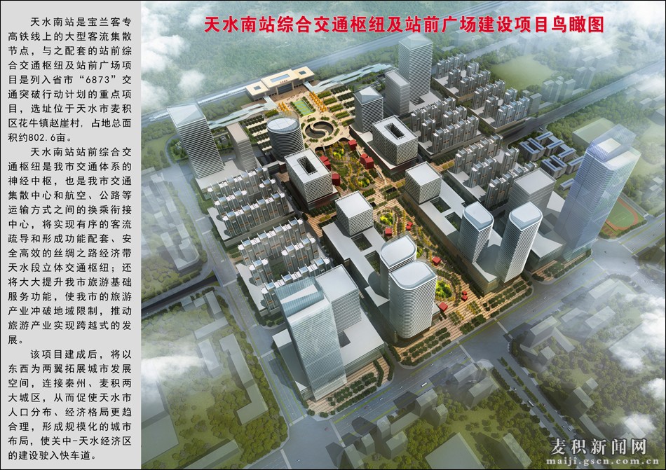 據(jù)了解,天水南站站前廣場(chǎng)及綜合交通樞紐項(xiàng)目位于麥積區(qū)花牛鎮(zhèn)趙崖村,東至在建高鐵佳苑、西至廿鋪工業(yè)園區(qū)4號(hào)路、南至高鐵天水南站、北至羲皇大道,占地約802畝。建設(shè)集綜合交通樞紐、站前廣場(chǎng)、城市公園、旅游服務(wù)中心、商業(yè)辦公及市政設(shè)施等于一體的城市綜合體。項(xiàng)目整體規(guī)劃分三期實(shí)施。一期工程由站前廣場(chǎng)及綜合交通樞紐、市政道路和地下綜合管廊三大部分組成,占地約240畝,建筑面積約11.14萬(wàn)㎡,概算投資約9.56億元;主要建設(shè)長(zhǎng)途客運(yùn)站、公交站、旅游大巴站、出租車(chē)站、社會(huì)車(chē)輛停車(chē)庫(kù)、商業(yè)與換乘服務(wù)大廳等,擬建停車(chē)位1167個(gè)。二期占地約142.4畝,建筑面積13.86萬(wàn)㎡,主要建設(shè)旅游集散中心、商業(yè)服務(wù)中心及中軸線公園等。三期主要以交通樞紐和旅游服務(wù)為核心,建設(shè)集公寓酒店、商務(wù)辦公、旅游服務(wù)及配套校舍等功能于一體的城市綜合體。