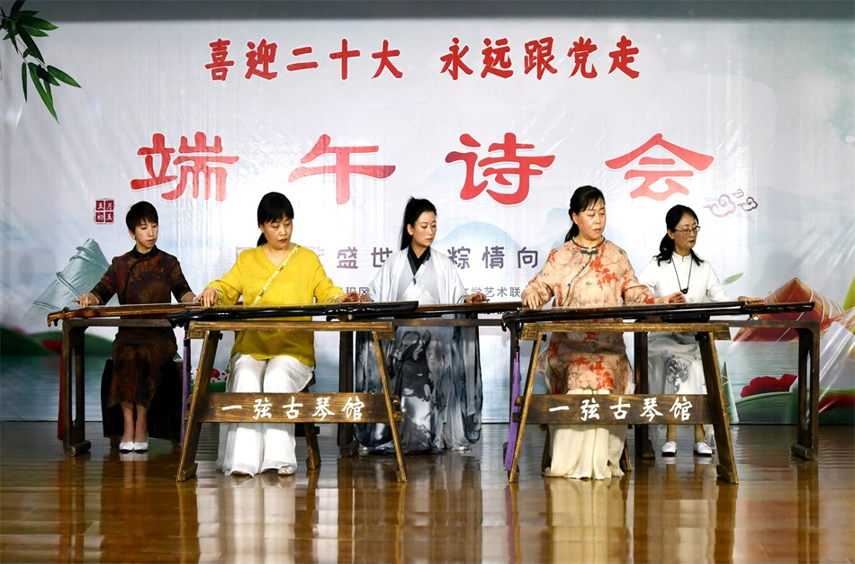 此次詩會節(jié)目形式多樣,既有古琴、二胡、竹笛、葫蘆絲古韻悠長的《離騷》《敕勒歌》《一袖云》等曲藝演奏,又有朗誦、歌曲、舞蹈美輪美奐的《端午情》《屈原頌》《只此青綠》激情展現,還有舞、音、畫完美結合的《水墨中國》等11個精彩節(jié)目,在演員們時而鏗鏘有力、時而跌宕起伏、時而低回婉轉的表演中,抒發(fā)著對祖國母親的無比熱愛。