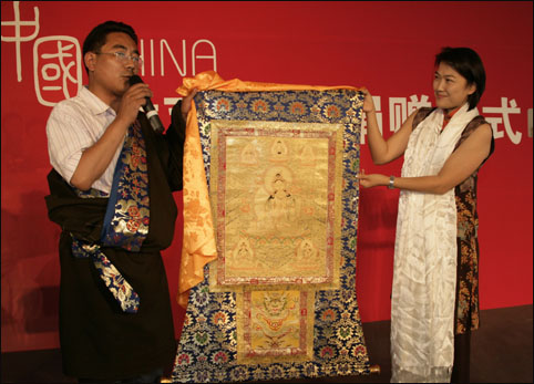 阿更登副州長向張欣贈送金箔西藏唐卡