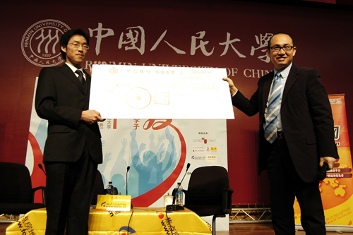 【主持人】:接下來把時間留給大家提問。提問之前有一個儀式,我們說“愛心暖學(xué)子”就是潘總將會為12所學(xué)校的貧困生捐助學(xué)習(xí)和生活的費(fèi)用,潘總今天給人大也帶來一筆善款。