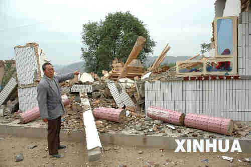 7月12日,在靜寧縣八里鎮(zhèn)高城寨村,一位村民站在倒塌的房屋旁。 新華社記者 王艷明 攝