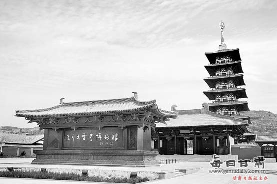 沐浴著金燦燦的陽(yáng)光,我們來到大云寺博物館采訪。遠(yuǎn)遠(yuǎn)望去,墨灰色的大云寺四角方塔高高聳立,巍峨壯觀。方塔最前方是獨(dú)具風(fēng)格的仿唐綠色花崗巖影壁,上面有省委書記、省人大常委會(huì)主任陸浩題寫的“涇川大云寺博物館”金色大字。轉(zhuǎn)過影壁,眼前是寬展展的仿古青磚鋪設(shè)的廣場(chǎng),廣場(chǎng)正中地面上用紅砂巖刻一形似方印的地雕,寫有“大周涇州大云寺舍利之函總一十四!钡木薹笞,見證著大云寺文化遺產(chǎn)悠久的歷史。
