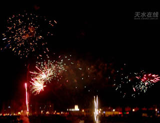 記者在焰火晚會(huì)現(xiàn)場(chǎng)看到,一輪明月照耀下的成紀(jì)大道、西大橋兩端和葫蘆河岸上人山人海,觀看焰火。