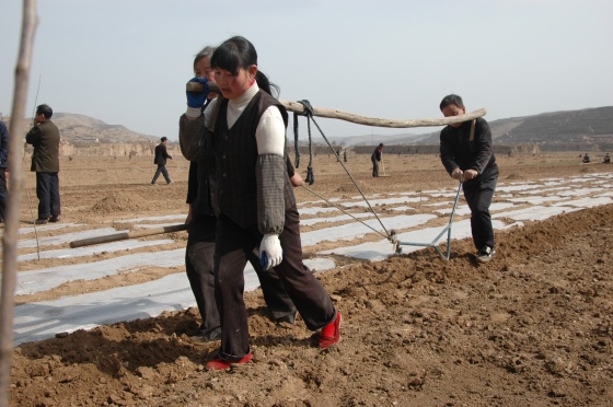 3月12日,當記者來到大地灣遺址所在地的五營鄉(xiāng)邵店、徐洼等村時,只看到山坡上、河灣里人頭攢動,機器轟鳴。懸耕機來回穿梭,松土施肥,古典式的步犁“二人抬杠”起壟覆膜 ,婦女老人壓土整地,青年男子耕耱打耙,鋪成的白色塑料覆膜,與流淌的清水河,吐綠發(fā)芽的柳樹,整個構成了一幅搶墑覆膜的春耕圖。