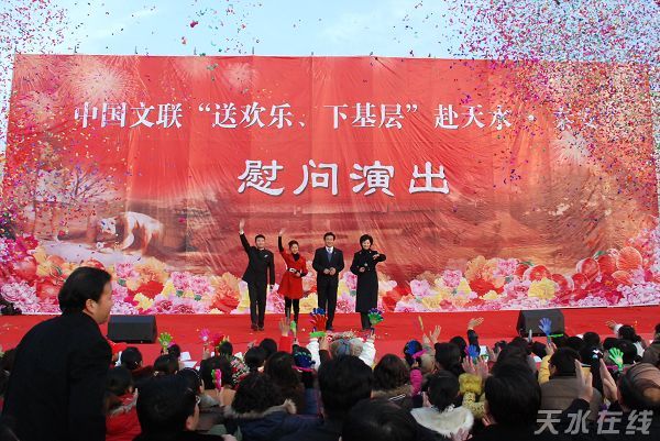 值此辭舊迎新的喜慶時(shí)刻,我們迎來了胡振民主席率領(lǐng)的中國(guó)文聯(lián)“送歡樂下基層”慰問演出的各位領(lǐng)導(dǎo)和藝術(shù)家們。在此,我謹(jǐn)代表天水市委、市人大、市政府、市政協(xié)和360萬天水人民,向各位領(lǐng)導(dǎo)和全體演職人員及新聞界的朋友們表示熱烈的歡迎和誠(chéng)摯的問候!向長(zhǎng)期以來關(guān)心和支持天水發(fā)展的各位領(lǐng)導(dǎo)和社會(huì)各界人士表示衷心的感謝!致以新年的祝福和美好的祝愿!
